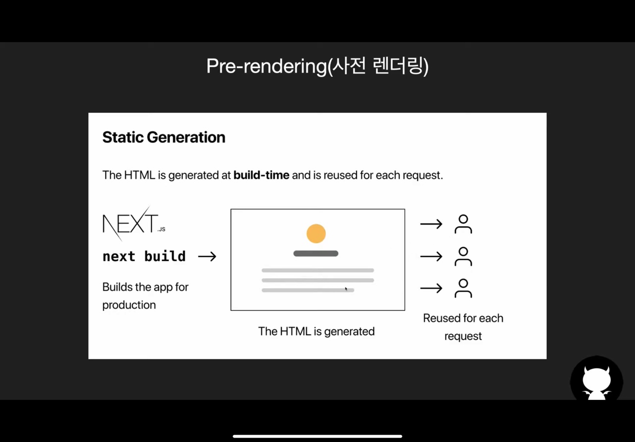 정적 페이지는 build 시에 html이 생성하는 프리렌더링 방식이다. 미리 렌더링 된 html을 유저들이 요철 할 때마다 재상 용해서 준다. 속도가 빨라서 대부분의 페이지에 이용된다.