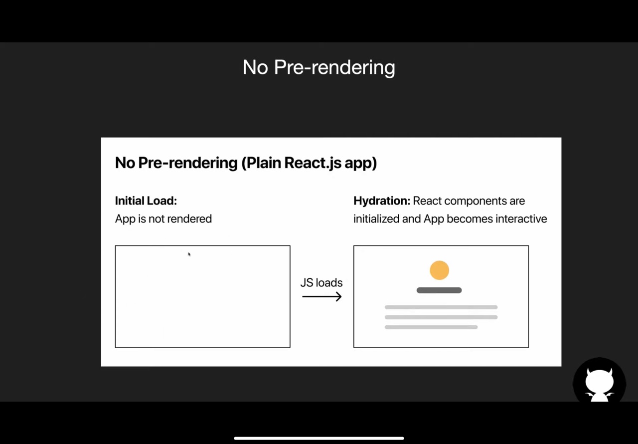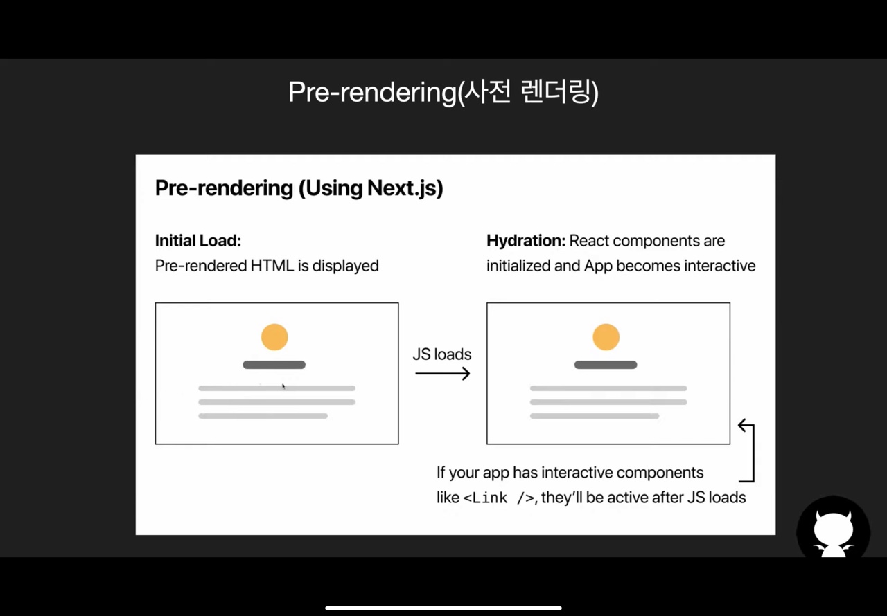 next는 프리렌더링을 기본으로 한다. 프리렌더링 시 렌더링 전 HTML을 먼저 노출시킨 후 렌더링 후 js의 요소들을 작동한다.