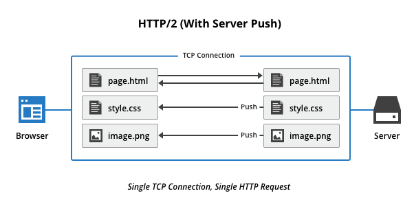 -서버 푸시 : 브라우저가 요청하지 않으면 서버는 응답하지 않는 것이 보통이지만, 요청한 HTML 문서에 리소스가 포함되어 있는 경우 서버가 브라우저에게 밀어주는(push)방식을 취하여 브라우저의 요청을 최소화시킨다.
