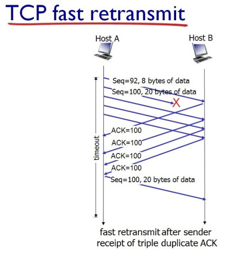 빠른 재전송은 먼저 도착해야 하는 패킷이 도착하지 않고 다음 패킷이 도착한 경우에도 수신자가 일단 ACK패킷을 보내는 방식이다. 중간에 패킷 하나 손실되면 송신자는 중복된 ACK 패킷을 통해 이를 감지하고 유실되었던 패킷을 재전송한다. 또한 중복된 패킷을 3개 받으면 반드시 손실된 패킷을 재전송한다.