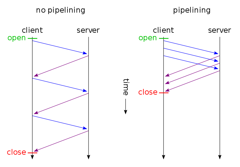 - HTTP 파이프라이닝은 요청의 응답이 없어도 다음 요청을 병렬적으로 수신자 측에 전송하는 기술이다. 즉 응답 지연이 발생하더라도 클라이언트는 먼저 서버 측의 응답을 받을 수 있어 빠른 웹 로딩이 구현된다.