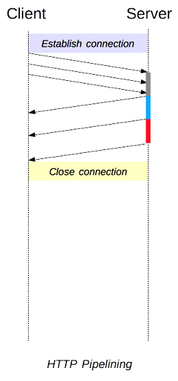 - 파이프라이닝 : 브라우저가 웹 서버에 여러 개의 콘텐츠를 요청했을 때, 이전 요청에 대한 응답을 완전하게 받지 않더라고 하나의 TCP 연결 내에서 미리 다음 요청에 대한 처리를 시작하면서 전체적인 전달 시간을 줄이는 방식이다.